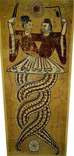 | Urkaisertum China Der angebliche erste chinesische Urkaiser Fu Xi, der nach Überlieferung von später niedergeschriebener Mythen die "Acht Trigramme des Yijing" (I Ging, Buch der Wandlungen) erfunden hat, indem er über Himmel und Erde meditierte, wird der erste Kaiser von China. Fu Xi herrscht als Himmelssouverän Tianhuáng der Überlieferung zufolge bereits rund 18.000 Jahre und wird als Gott verehrt, der den Menschen Melodie und Musik brachte. Der selben Legende nach wird er in China auch als der Urahn der Menschen angesehen, der den nachfolgenden Menschen beibrachte, wie man Netze und Jagen und Fischen benutzen und geknotete Schüre zum Messen von Zeit und Entfernungen verwenden kann. Auch soll er die Medizin erfunden haben. Angeblich erlernte er die Kunst des Schreibens von einem gelehrten Drachen, der ihm am Ufer des Gelben Flusses begegnet sei. Als seine Gattin gilt Nui Gua, die der frühchinesischen Mythologie zufolge nach der Erschaffung der Welt die Schöpfergöttin des Menschengeschlechtes wurde. Nui Gua soll die Musik erfunden und die Menschen aus Lehm erschaffen sowie den Himmel stabilisiert haben. Oft wird Nui Gua au auch die "Herrin der Dunkelheit" genannt. Sie gehört zu den "Erhabenen" unter den chinesischen Urkaisern. Fu Xi und Nui Gua könnten auch Geschwister sein. Beide werden mit einem menschlichen Oberkörper und Schlangenleib oder Fischschwanz als Unterkörper dargestellt. Nui Gua und Fu Xi gelten zusammen als „Erfinder“ der Ehe. Sie waren ursprünglich die einzigen Wesen und wollten nicht heiraten, weil sie keinen Inzest begehen wollten, aber ein Orakel mit zwei Rauchwolken, die sich in der Luft vereinten, sahen sie als Zeichen, dass sie einander heiraten sollen. Als der Kosmos noch ungeordnet war, hatten Himmel und Erde der chinesischen Mythologie zufolge ihre Plätze noch nicht eingenommen, die Himmelsrichtungen waren vertauscht, überall loderte Feuer, und zugleich hatte die Flut das Land überspült. Nui Gua schmolz Gestein, um den Himmel zu flicken. Aus den vier Füßen der Schildkröte formte sie die vier Himmelsrichtungen, mit der Asche von Schilf dämmte sie die Fluten ein und um die Ordnung auf dem Land herzustellen, tötete sie den Schwarzen Drachen. Nui Gua reparierte auch einen der Pfeiler, die den Himmel hielten, welcher bei einem Kampf der Götter zerbrochen war. Da die Reparatur nicht ganz gelang, ist eine der Himmelssäulen niedriger. Dies hat zur Folge, dass die chinesischen Flüsse vorwiegend nach Südosten fließen. In einem alten Sintflutmythos treten die beiden als Geschwisterpaar auf, von dem die Menschheit in der erneuerten Welt abstammt. Shennong, der dritte Urkaiser, lebt der Überlieferung zufolge angeblich bereits seit etwa 5000 Jahren und lehrt die Menschen, Ackerbau zu betreiben und untersucht die Pflanzen auf ihre medizinischen Eigenschaften. Auch die Entdeckung des Tees wird ihm zugeschrieben. Die wörtliche Übersetzung von Shennong ist „Göttlicher Landmann“, "König des Bauern". Die Ergebnisse seiner Heilpflanzenstudien soll er in einem dreiteiligen Buchband über medizinische Pflanzen und Kräuter zusammengestellt haben, dem „Klassiker der Heilkräuter nach Shennong“. Das Werk, das 365 Kräuter und Substanzen behandelt, wird allerdings erst gegen Ende der Westlichen Han Dynastie kompiliert werden. Als vermeintlicher Bruder des Gelben Kaisers wird er als einer der mythischen Patriarchen der Chinesen angesehen. Die Han-Chinesen betrachten beide als ihre Urahnen. Auch in Vietnam wird er als Urahn verehrt. Er gilt in der chinesischen Mythologie als einer der drei Erhabenen, die als Gründer der Kultur betrachtet werden. Deshalb wird er für seine Taten zum Wohle der Menschheit als Gott verehrt. Shennong soll im Verbund mit Fu Xi und Huáng Dì bei der Erfindung des Musikinstrumentes Guqin mitgewirkt haben. | |||||||||||||||||||||||||
