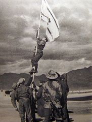 The Ink Flag (Hebrew: דֶּגֶל הַדְּיוֹ‎‎, Degel HaDyo) was a handmade Israeli flag raised during the 1948 Arab–Israeli War to mark the capture of Eliat. This image is in the public domain. Translation of the Hebrew notes/comments that were included with the previous version of this image (via Google Translate):