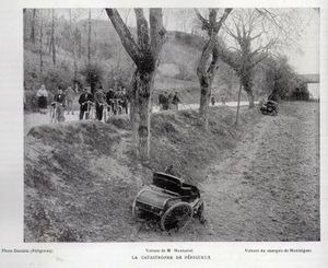 | Französische Republik Um Périgueux herum findet das zweite Autorennen dieses Jahres statt. Panhard trägt einen Doppelsieg davon. Der Marquis de Montaignac erleidet den ersten tödlichen Unfall bei einem Autorennen in der Geschichte des Automobilsports. Drei Kilometer nach der Abfahrt holt der Marquis de Montaignac, der als Letzter startete, seinen Konkurrenten de Montariol auf einem Benz ein und versucht, ihn zu überholen. Dabei berühren sich offenbar beide Fahrzeuge; der Benz von de Montariol kann sich nicht auf der schmalen Landstraße halten und steuert ebenfalls nach rechts zu einem Abhang. Während de Montariol rechtzeitig aus dem Auto springen kann, kann sein Mechaniker das Automobil vor dem Sturz nicht mehr verlassen. In der Befürchtung, einen schrecklichen Unfall verursacht zu haben, wendet sich der Marquis de Montaignac bei einer Geschwindigkeit von 28 Stundenkilometern um und verliert selbst die Kontrolle über sein Fahrzeug. Das Auto überschlägt sich und stürzt ebenfalls rechts in die Schlucht. Sowohl der Marquis als auch sein Beifahrer werden unter dem 800 Kilogramm schweren Fahrzeug begraben. Während der Beifahrer einen Beinbruch und möglicherweise Verletzungen an der Brust erleidet, sind die Verletzungen des Marquis fatal. Er ist noch in der Lage, zu sprechen, aber verliert nach einer halben Stunde das Bewusstsein. Seine Verletzung des Unterkörpers und das Zusammenpressen seines Herzens führen bei dem 22jährigen begeisterten Automobilrennfahrer drei Stunden nach dem Unfall zum Tod. Die Organisatoren erklären später, dass dieser Unfall aufgrund menschlichen Versagens des Marquis in einem Moment geschah, als sich die Fahrzeuge auf einer flachen Straße befanden und frei von jedem Hindernis. Der Sieger des Rennens, Gustave Leys, siegt mit einer Durchschnittsgeschwindigkeit von 44,04 km/h. Da es sich um ein rein französisches Rennen handelt, kommt es nicht in die Wertung für die inoffizielle Weltmeisterschaft. Das Ergebnis: 1 | ||||