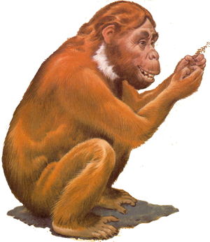 Ramapithecus (Quelle: http://www.arthursclipart.org/prehistoricman/cave/page_02.htm) Die ersten Menschenaffen Asiens existieren in den nachweisbaren Gattungen Sivapithecus und Ramapithecus. Wegen seines menschenähnlichen Gebisses wird Ramapithecus im frühen vorigen Jahrhundert als Stammvater der Menschenartigen angesehen, später allerdings wird erkannt, dass er mit dem Orang-Utan enger als mit dem Menschen verwandt ist. Die Menschenaffen sind höher entwickelt als die Halbaffen und Affen. Sie haben ein größeres Gehirn und ein haarloses Gesicht, mit dem sie ihre Stimmung ausdrücken können. | ||||||