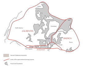 Phanerozoikum – Paläozoikum – Silur – Llandovery - Aeronium - Gondwana Phanerozoikum – Paläozoikum – Silur – Llandovery - Aeronium - Avalonia / Baltikum / Laurentia / Laurussia Der Kontinentverbund Avalonia und Baltikum kollidiert mit dem Kontinent Laurentia, der heute in Nordamerika, Grönland, dem nördlichen Irland und Schottland zerfallen ist. Der Iapetus-Ozean beginnt sich östlich von Laurentia auszuweiten. Seine Platte subduziert unter die Ostküste, hebt die kontinentale Kruste und bewirkt eine Periode des Vulkanismus. Auf Laurentia entstehen die Appalachen, während zur selben Zeit an der anderen Seite des Meeres, auf dem bereits vereinigten Baltikum/Avalonia, die Kaledonischen Gebirge wachsen. Der neue Kontinent trägt den Namen Laurussia. Man könnte ihn auch als Euramerica bezeichnen. | ||||||