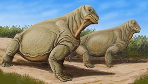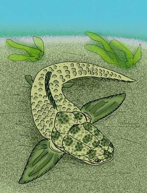 | Phanerozoikum – Paläozoikum – Perm – Cisuralium - Artinskium Infolge der Abkühlung des Weltklimas und der darauf folgenden Eisbildung an den Polen zieht sich das Meer zurück. Die Trilobiten sterben aus und die Florfliege existiert bereits. Wahrscheinlich findet jetzt eine Abspaltung der Archosaurier und der Dinosaurier von den sonstigen Reptilien statt. Bärlapp und Schachtelhalm werden seltener. Stattdessen kommen kleine Farne und Nadelhölzer auf. | ||||||
