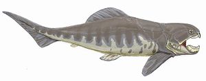 | Phanerozoikum – Paläozoikum – Devon – Unterdevon - Pragium - Gondwana In Südafrika lebt der als "heute noch lebendes Fossil" bekannte Quastenflosser der Art "Latimeria chalumnae", der zur Reihe der Knochenfische gehört. Heute gilt der Quastenflosser als Verwandter der Lungenfische. | ||||||