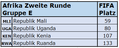 - (Herunterladen) 2022 Quali Afrika Gruppe E Tabelle Spieltag 1.png . . 994 × 182 . . 19 KB . . Oteriwutaban . . 15:59, 28. Nov. 2022