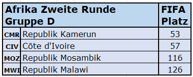 - (Herunterladen) 2022 Quali Afrika Gruppe D Tabelle Spieltag 3.png . . 996 × 183 . . 21 KB . . Oteriwutaban . . 15:57, 28. Nov. 2022