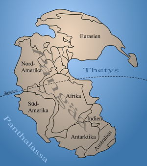 | Phanerozoikum – Mesozoikum – Trias – Untertrias - Indusium - Pangaea Das Indusium (auch Induum, Induium, Indus-Stufe), in der Erdgeschichte die erste beziehungsweise unterste chronostratigraphische Stufe der Trias. Das Indusium war früher zusammen mit dem Olenekium ein Teil der Skyth-Stufe (Skythium), die jedoch keine offiziell anerkannte internationale Stufe mehr ist und nur noch regional (zum Beispiel in den Alpen) benutzt wird. Die ursprüngliche Typlokalität liegt in der Salt Range (Punjab), am Oberlauf des Flusses Indus, der hauptsächlich durch Pakistan fließt; davon ist der Name abgeleitet. Der Beginn der Stufe wird mit dem Erstauftreten der Conodonten-Art Hindeodus parvus und dem Ende der negativen Kohlenstoff-Anomalie nach dem Höhepunkt des oberpermischen Massenaussterbens definiert. Das Erstauftreten der Ammoniten-Art Meekoceras gracilitatis markiert das Ende der Stufe. Der Sauerstoffanteil der Luft beträgt mit 16 Prozent etwa 80 Prozent des heutigen Niveaus. Der atmosphärische Kohlendioxid-Anteil beträgt das Sechsfache des heutigen Anteils mit etwa 1750 ppm. Die Durchschnittstemperatur liegt mit 17 Grad Celsius etwa 3 Grad Celsius über dem heutigen Niveau. Das Klima der Trias ist warm bis heiß. Europa liegt im subtropischen Wüstenbereich. Auch weltweit ist das Klima wohl eher trocken: Der Grund liegt in der Form des Superkontinentes Pangaea und einem daraus resultierenden Monsuneffekt, bei dem die sommerlichen Tiefdruckgebiete über der Landmasse hauptsächlich Luft von anderen inneren Landesteilen ansaugen und nicht vom Ozean, ähnlich der heutigen Situation in Südarabien. Im Binnenland sind vermutlich ausgedehnte Wüsten vorhanden. In der Nähe des geographischen Nordpols befindet sich nach den derzeitigen Rekonstruktionen ein Teil Ostsibiriens. Der Superkontinent Pangaea, der fast die gesamte Landmasse enthielt und sich vom Nordpol bis zum Südpol spannt, ermöglicht die uneingeschränkte Verbreitung der Landtiere. | ||||||