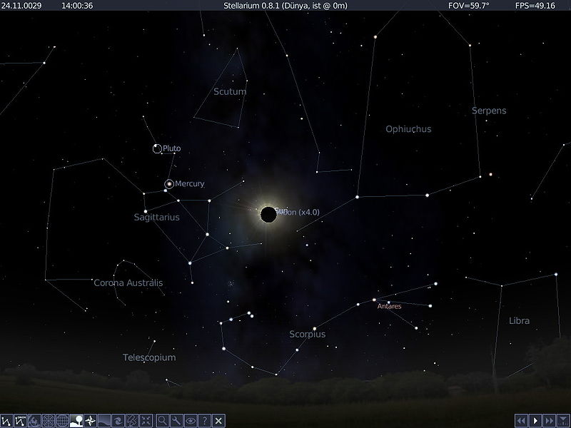 | 17:05, 27. Sep. 2020 | Sonnenfinsternis 0029-11-24.jpg (Datei) | 42 KB | Oteriwutaban | Von Nevit Dilmen - Screenshot of GNU program Stellarium, CC BY-SA 3.0, https://commons.wikimedia.org/w/index.php?curid=1552323 | 1 | |